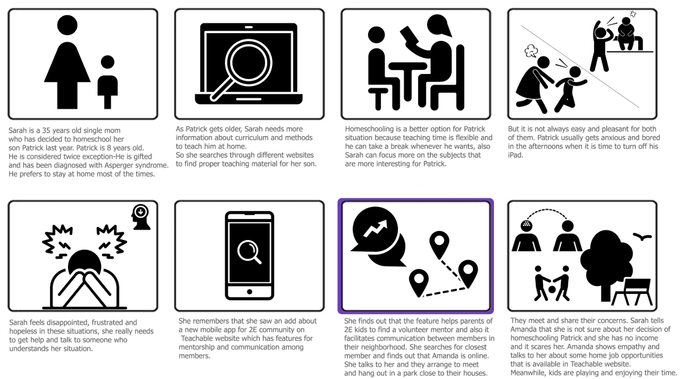 To better understand the situation I created a persona, scenario, and storyboard to define multiple touchpoints based on the data that I collected. Results showed that however many challenges homeschooling parents have, there are 10 times more for 2e homeschooling parents and there is not enough immediate and organized help and support for them.